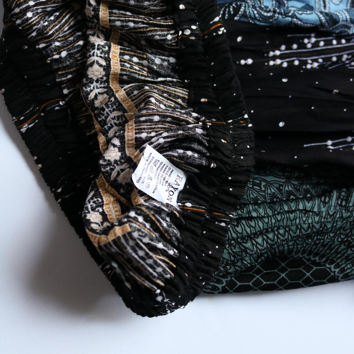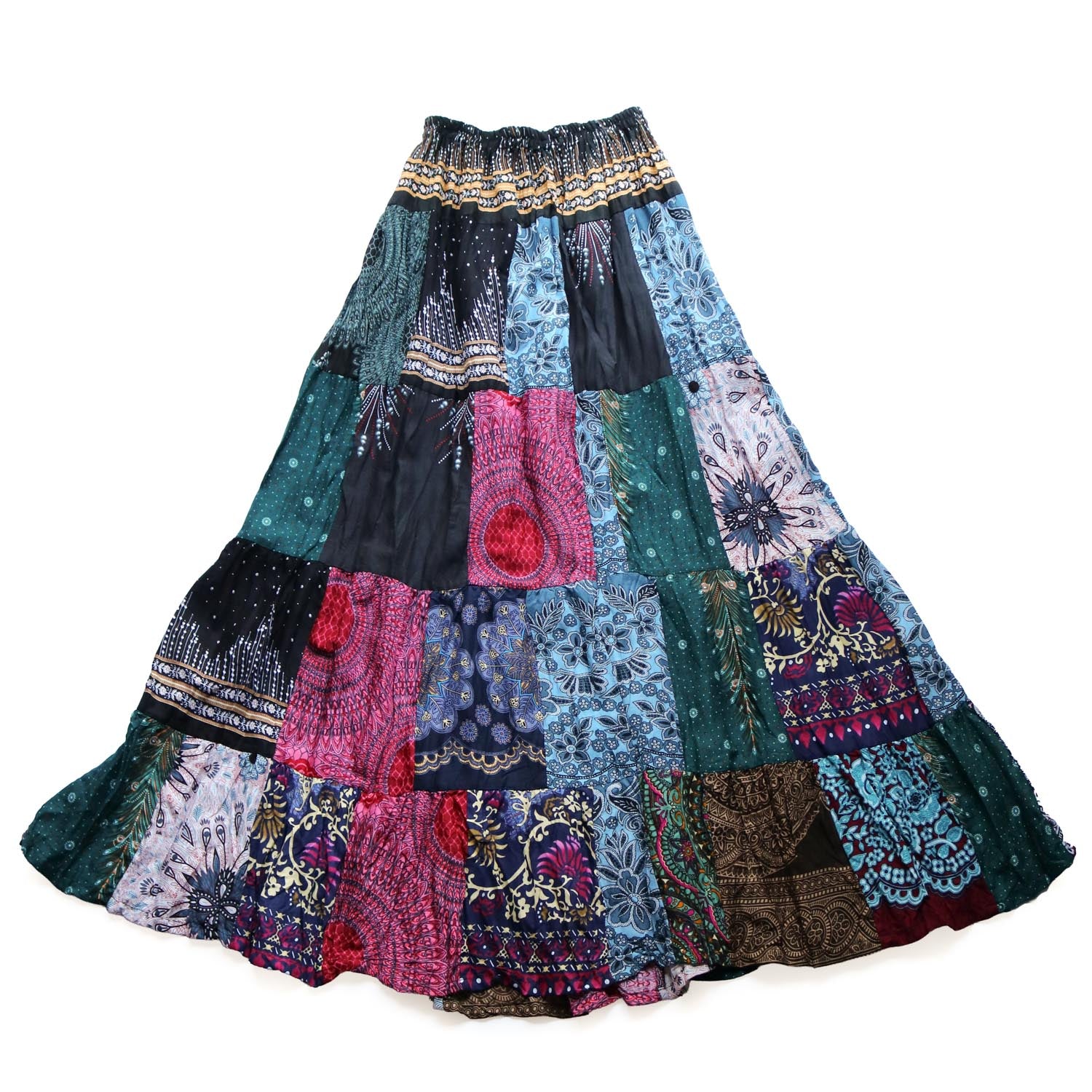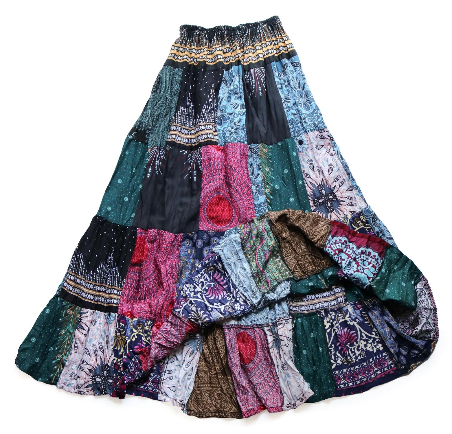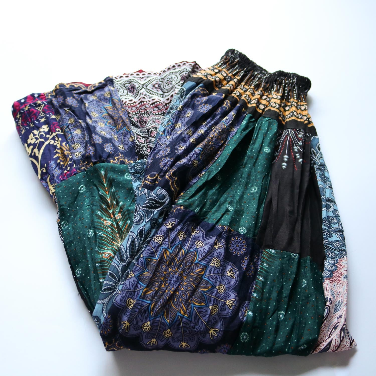 タイの職人が、様々な伝統柄の布を一枚ずつ繋ぎ合わせて作り上げた、ボリュームたっぷりのロングスカートです。同じ組み合わせは二度と作れない、まさに一期一会のアイテムです。